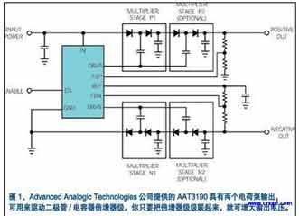AdvancedAnalogicTechnologies公司的副總裁JanNilsson評(píng)述道:“許多手機(jī)、數(shù)碼相機(jī)及其它便攜式設(shè)備中的有源矩陣LCD和OLED……子系統(tǒng)要求正負(fù)兩種小電流偏置電源。”這種情況使得電源前景復(fù)雜化。AdvancedAnalogicTechnologies公司推出的AAT3190能滿足這種需求,因?yàn)樗柚粔K采用自同步雙電荷泵體系結(jié)構(gòu)其工作于標(biāo)稱1MHz的開(kāi)關(guān)頻率芯片來(lái)生成正負(fù)兩種電源(圖1)。這種電荷泵可利用2.7V~5.5V的單極性輸入電源產(chǎn)生最大可達(dá)±25V的可調(diào)輸出電壓。