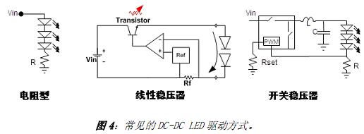 采用 DC-DC 電源的LED 照明應(yīng)用中,可以采用的LED 驅(qū)動(dòng)方式有電阻型、線性穩(wěn)壓器及開(kāi)關(guān)穩(wěn)壓器等,基本的應(yīng)用示意圖參見(jiàn)圖 4。電阻型驅(qū)動(dòng)方式中,調(diào)整與LED 串聯(lián)的電流檢測(cè)電阻即可控制LED 的正向電流,這種驅(qū)動(dòng)方式易于設(shè)計(jì)、成本低,且沒(méi)有電磁兼容(EMC)問(wèn)題,劣勢(shì)是依賴(lài)于電壓、需要篩選(binning) LED,且能效較低。