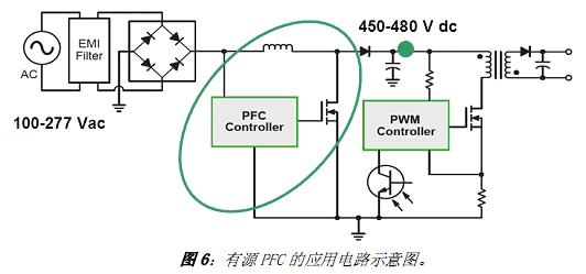 有源 PFC(見(jiàn)圖6)通常是作為一個(gè)專(zhuān)門(mén)的電源轉(zhuǎn)換段增加到電路中來(lái)改變輸入電流波形。有源PFC 通常提供升壓,交流100 至277 Vac的寬輸入范圍下,PFC 輸出電壓范圍達(dá)直流450 至480 Vdc。如果恰當(dāng)?shù)卦O(shè)計(jì)PFC 段,可以提供91%到95%的高能效。但增加了有源PFC,仍然需要專(zhuān)門(mén)的DC-DC 轉(zhuǎn)換來(lái)提供電流穩(wěn)流。