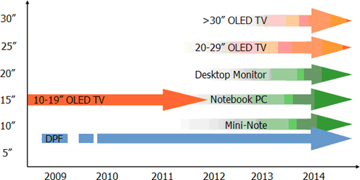 據(jù)DisplaySearch顯示技術研究總監(jiān)Jennifer Colegrove表示,AMOLED面板已成為高端電子產(chǎn)品突顯差異化的主要方式之ㄧ。同時該顯示技術不僅僅可應用于手機主屏,目前已逐步被應用在個人多媒體顯示裝置 (PMP)、數(shù)碼相機等。我們估計接下來3年全球將有大約20條新的或者舊線升級AMOLED生產(chǎn)線將會籌備完成。多數(shù)OLED廠商目標仍是希望生產(chǎn)大尺寸OLED TV,以LG Display為例,目前已順利量產(chǎn)小尺寸AMOLED面板,同時宣布今年底要量產(chǎn)15寸電視機面板。LG Electronics擬在今年底假期推出15寸OLED TV;然而Sony于2008年公布了20寸OLED TV之后,2009年尚未計劃推出20寸以上的OLED TV。