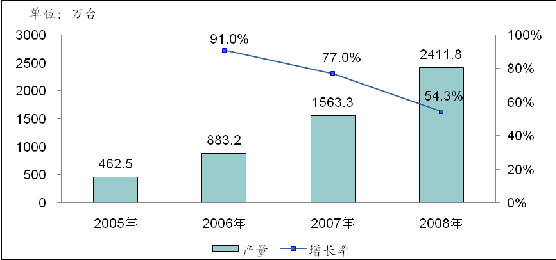 隨著傳統(tǒng)CRT彩電的逐漸被取代,液晶電視的普及已經(jīng)成為不可逆轉(zhuǎn)的趨勢(shì),并且普及的速度在不斷加快。中國(guó)作為全球最大的彩電制造基地和彩電消費(fèi)市場(chǎng),在彩電工業(yè)的轉(zhuǎn)型過(guò)程中,液晶電視的產(chǎn)量也出現(xiàn)了爆發(fā)式的增長(zhǎng)。根據(jù)賽迪顧問(wèn)統(tǒng)計(jì),2005年-2008年,中國(guó)液晶電視產(chǎn)量的年均復(fù)合增長(zhǎng)率高達(dá)73.4%,2008年產(chǎn)量達(dá)到2411.8萬(wàn)臺(tái)。