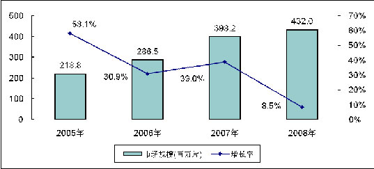 圖表 2 2005年-2008年全球大尺寸TFT-LCD面板銷(xiāo)售量及增長(zhǎng)率