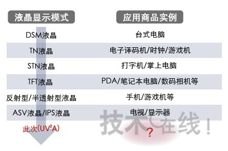 液晶顯示模式每進一步,都會創(chuàng)造出新應(yīng)用商品。UV2A是夏普創(chuàng)造的詞,意思是使用UV的VA。(圖:本站根據(jù)夏普的資料制成)