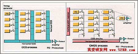 CMOS應(yīng)用半導(dǎo)體工業(yè)常用的MOS制程,可以一次整合全部周邊設(shè)施于單晶片中,節(jié)省加工晶片所需負(fù)擔(dān)的成本和良率的損失;相對地CCD采用電荷傳遞的方式輸出資訊,必須另辟傳輸通道,如果通道中有一個(gè)畫素故障(Fail),就會導(dǎo)致一整排的訊號壅塞,無法傳遞,因此CCD的良率比CMOS低,加上另辟傳輸通道和外加ADC等周邊,CCD的制造成本相對高于CMOS?!?br />