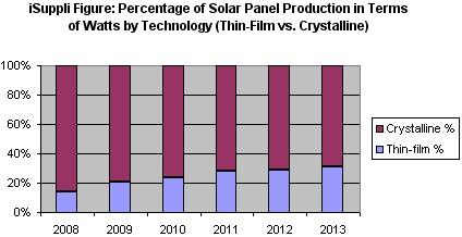 到2013年,在全球太陽電池板市場上,薄膜的效率將從2008年的14%增加到31%。下圖所示為iSuppli公司對全球太陽能電池生產(chǎn)中薄膜和晶體技術(shù)所占比例的預(yù)測。