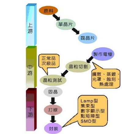 (三)下游:晶粒封裝。將晶粒黏于導(dǎo)線架,依產(chǎn)品應(yīng)用的不同,將晶粒封裝成不同的LED。