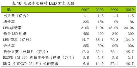 戴爾的這一舉措表明 LED 已經(jīng)不再作為概念機(jī)型或者說時(shí)尚機(jī)型,而是作為標(biāo)準(zhǔn)配置,其價(jià)格策略必然不再采取高端策略。戴爾作為行業(yè)內(nèi)的領(lǐng)導(dǎo)廠商之一,其他公司必然跟進(jìn)。因此2009 年LED 在筆記本的滲透率有望達(dá)到20%以上。2007年全球筆記本出貨1.09 億臺(tái),2008年增長(zhǎng)15%,2009 年增長(zhǎng)10%,則2009 年筆記本出貨1.4 億臺(tái),其中將有2800 萬臺(tái)使用LED,對(duì)LED 的需求量是70.3 億粒。