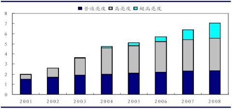 2008年全球LED市場(chǎng)規(guī)模約為69億美元,其中高亮度和超高亮度LED 市場(chǎng)年平均增長(zhǎng)率將達(dá)到20%左右,市場(chǎng)規(guī)模達(dá)16億美元。在移動(dòng)手機(jī)應(yīng)用市場(chǎng)的快速推動(dòng)下,過去10年高亮度LED市場(chǎng)的年均增長(zhǎng)率達(dá)到46%。
