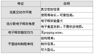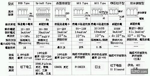 然電漿顯示器(plasma)與LCD(LiquidCrystalDisplay)等平面顯示器(FlatPanelDisplay)已經進入商品化階段,不過耗電量、輝度、對比以及動畫反應時間等問題,若與傳統(tǒng)CRT比較時仍有改善的空間,另一方面有機EL等諸多新世代平面顯示器(表1)卻面臨制程、成本、使用壽命、大型化等瓶頸,因此至今仍無法實用化。有鑑于此松下電工與東京農工大學利用BSD(BallisticelectronSurfaceemittingDevice)概念制作場發(fā)射顯示器(FED:FieldEmittingDisplay)。