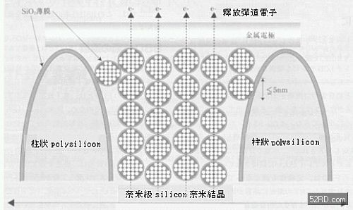 BSD是將silicon奈米結晶化形成鎖鍊狀結構,藉此使電子呈彈道狀移動,一般將此現(xiàn)象稱為彈道電子輸送。圖1是BSD電子源的動作機制說明圖,基本上它是在柱狀polysilicon之間形成電子drift層,polysilicon與奈米結晶silicon混合的systemunit稱為NPS層(NanocrystallinePoly-Siliconlayer),雖然NPS層是利用陽極氧化技術制成,不過在polysilicon的結晶粒界的glen部位會產生快速反應,因此polysilicon結晶粒的表面,支配性形成奈米結晶silicon,使得NPS層內殘留的silicon結晶粒比奈米結晶silicon多,該殘留的柱狀polysilicon可幫助散熱,進而提高冷陰極的電子熱傳導穩(wěn)定性,所以BSD釋放電子時幾乎不會產生閃爍噪訊(flickernoise)。