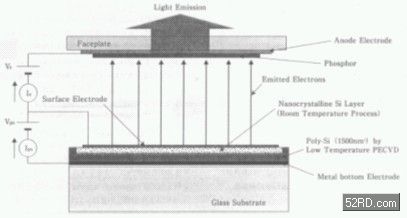 BSD釋放電子時是利用電子作熱激發(fā),使電子從基板下方注入NPS層,由于奈米結晶silicon的表面,是利用低溫氧化制程制成氧化薄膜,因此施加的電壓幾乎全部流入該氧化膜層內進而形成強電界領域,而氧化膜的厚度非常的薄,所以電子很容易將強電界領域的氧化膜變成tunnel,并進入鄰接的奈米結晶silicon內,隨著電子通過氧化膜被加速,并朝向表面電極方向前進,如此反覆相同動作所以到達表面附近的電子,具備比熱平衡狀態(tài)更高的運動能量,而表面電極也變得很容易將成為tunnel的電子釋放至真空中。