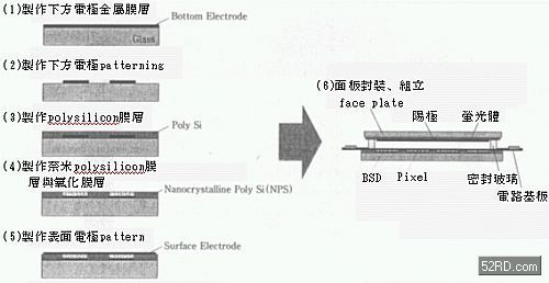 由于BSD的彈道電子釋放現(xiàn)象所產生的電子發(fā)射角度幾乎是無偏差的垂直角,因此BSD的FED可無限制的選用適用的spacer。如上所述BSD最大特點(advantage)是它的制作性,傳統(tǒng)高電壓型FED的發(fā)射電極(emitting)是先制作發(fā)射平臺(hall),再制作Al2O3與Wo、Ni等覆蓋層(scapegoatlay)垂直膜層,最后利用蝕刻(etching)技術去除覆蓋層,相較之下BSD之FED的電子發(fā)射源祇需制作復晶硅膜,之后再經過膜層多孔化與氧化等制程即可,如此簡易的制程對平面顯示器(FPD:FlatPanelDisplay)大型化與低價化具有加乘效應。