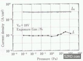 圖8是BSD電子源的周圍真空度發(fā)生變化時的emission電流變化特性,具體測試方法是將爐內更換成氮素,接著抽真空至10-4Pa再逐漸導入氮素,藉此觀察真空度變化時的emission電流變化,圖中的橫軸為真空度,縱軸為二極體(diode)的電流密度,由圖可知即使真空度降至10-4,emission的電流密度幾乎無任何改變,顯示BSD電子源在真空度非常惡劣的環(huán)境下,仍具備良好的emission特性。