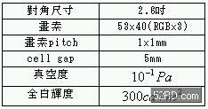 圖10表4分別是利率BSD技術制作之2.6吋彩色FED外觀圖與規(guī)格;由于BSD的電子發(fā)射源可在大cellgap環(huán)境下,以垂直方式在涂有螢光體的面板上產生圖樣(pattern),因此祇要驅動電路與驅動方式經由最加化設計,便可獲得令人滿意的影像顯示效果。