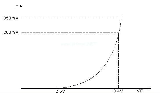 目前的新技術(shù)使LED能夠達到很高的功率水平,LED的功率能夠達到1W,甚至有些達到5W,光效達到60-85LM/W,這種LED設備稱為高亮LED(HB-LED)。目前我們用在照明上LED都是HB-LED,一般都是選擇1W的LED通過串并聯(lián)的方式組成大功率LED燈,尤其以串聯(lián)為主。這種LED的為3.4V±2%,正向電流為350mA左右。其-曲線如圖1.1所示。