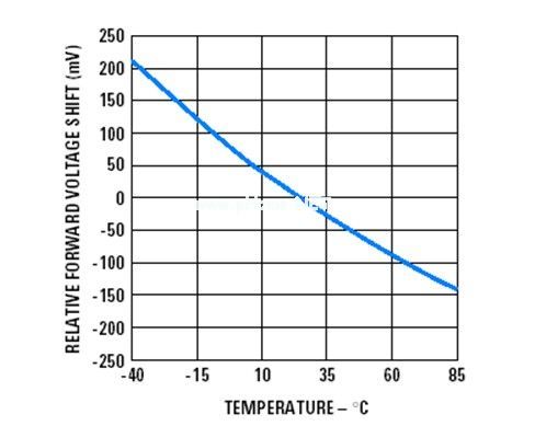 從圖1.2可以看出,隨著溫度的上升,會逐漸變小,相反,當溫度降低時,會增加。當LED的溫度上升到85度時,已經(jīng)有變成3.25V(3.4V-0.15V),相反當LED溫度降到-40度時,變成3.6V(3.4V+0.2V)。