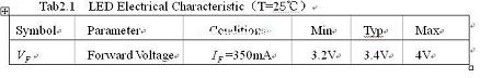 其次,恒功率控制都是預先假定輸出功率是恒定的,比如用9個1W(=3.4V, =350MA)的LED串聯(lián)起來用做一個9W的PAR燈,那么設計時候就會用=9W來計算。但實際上每個LED的都會偏差,偏差值如表2.1所示: