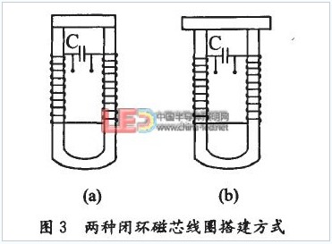 在磁芯材料確定的情況下,為了得到較大磁感應(yīng)強度B,需改變線圈中磁芯的結(jié)構(gòu)。若磁芯結(jié)構(gòu)設(shè)計為環(huán)形,由式(8)知,磁感應(yīng)強度B增大倍數(shù)理論上與磁芯的相對磁導(dǎo)率盧,大小相等,檢測信號幅值將達到最大。與條形磁芯同種材質(zhì)的u型磁芯上搭接一塊條形磁芯就構(gòu)成環(huán)形磁芯線圈,其搭接方式有兩種,如圖3示。