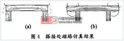 檢測時將繞有線圈的U型磁芯的一端插入圖1所示1閉合回路,感應(yīng)LED支架回路中回路電流產(chǎn)生的交變磁通,再將條形磁芯搭接在U型磁芯上,使感應(yīng)磁路閉合。由于搭接方式不同,兩種搭接方式的磁芯線圈處在支架回路所產(chǎn)生的交變磁場中時,其搭接處磁路也將不同,用AnsoftMaxwell軟件仿真兩種搭接方式的磁芯搭接處在交變磁場中的磁回路,結(jié)果如圖4示