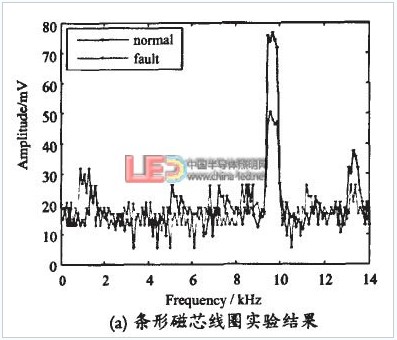 ①焊接質(zhì)量合格的LED,實驗檢測值與理論計算值相吻合。圖5(a)為使用條形線圈磁芯的實驗結(jié)果,封裝工藝中焊接質(zhì)量合格的LED,信號檢測端產(chǎn)生的光激勵信號經(jīng)放大、濾波、峰值檢波后幅值約為60mV。選12mil黃色LED芯片進行理論值計算,芯片面積A=0.3mm×0.3mm,取β=0.5當(dāng)單位時間內(nèi)單位面積被半導(dǎo)體材料吸收的平均光強(以光子數(shù)計)為5.45×1021個/m2s時,由式(1)可計算出光生電流約為42μA。由畢奧-薩伐爾定理、疊加定理及法拉第電磁感應(yīng)定律,可求得12mil黃色LED芯片在信號檢測端感生電動勢幅值約為63mV,去除實驗誤差和計算誤差,理論值和實驗值較好地吻合。