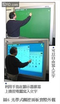 光學(xué)式觸控面板的設(shè)計必須考量雷射光線對人眼的安全,因此採用低功率半導(dǎo)體雷射,然而低功率半導(dǎo)體雷射卻會引發(fā)復(fù)歸光量不足等現(xiàn)象。此外,CCD會同時擷取燈泡與太陽等外部光線,必需透過軟體的信號處理技術(shù)克服。圖6是光學(xué)式觸控面板實際外觀。一般認(rèn)為,大型光學(xué)式觸控面板非常適合應(yīng)用在教育、運動以及各種商務(wù)簡報等領(lǐng)域。