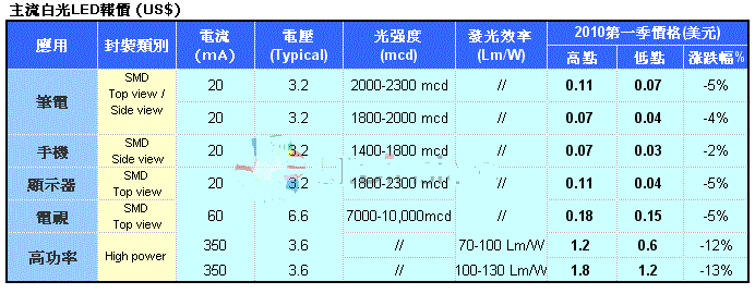 而在照明應(yīng)用的高功率LED部分,則由于亮度在70-90lm/W的供給增多,加上照明市場(chǎng)明顯增溫,廠商為擴(kuò)展市場(chǎng)佔(zhàn)有率,2010年Q1的照明用LED價(jià)格跌幅明顯大于背光用LED的價(jià)格。