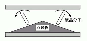 如圖,它依*叫做Protrusion的屋脊?fàn)钔蛊鹞飦硎挂壕П旧懋a(chǎn)生一個預(yù)傾角(Pre-tiltAngle)。這個凸起物頂角的角度越大,則分子長軸的傾斜度就越小。早期的VA模式液晶凸起物只在一側(cè),後期的MVA凸起物則在上下兩端。