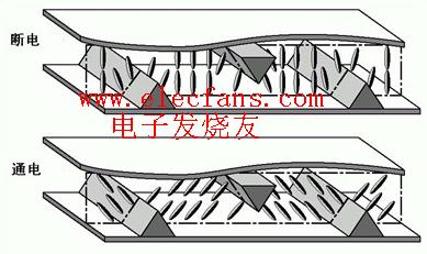 如圖是一種雙疇VA模式液晶。未加電時,液晶分子長軸垂直於螢?zāi)?,只有?近凸起物電極的液晶分子略有傾斜,光線此時無法穿過上下兩片偏光板。當(dāng)加電後,凸起物附近的液晶分子迅速帶動其他液晶轉(zhuǎn)動到垂直於凸起物表面狀態(tài),即分子長軸傾斜於螢?zāi)?,透射率上升從而實現(xiàn)調(diào)制光線。在這種雙疇模式中相鄰的疇分子狀態(tài)正好對稱,長軸指向不同的方向,VA模式就是利用這種不同的分子長軸指向來實現(xiàn)光學(xué)補償。如圖,在B處看到的是中灰階,在A和C處能同時看到的高灰階和低灰階,混色後正好是中灰階。