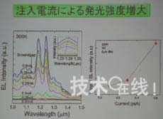 另外,該元件還呈現出如果增加注入電流、發(fā)光強度就會大幅提高的傾向,因此丸泉表示,“如果通過光子結晶形成共振器構造,就應該會產生激光振蕩。今后計劃將發(fā)光波長變更為可用于通信的1.5μm頻帶。將在2~3年后開發(fā)出作為光開關工作的元件,并實現實用化”。