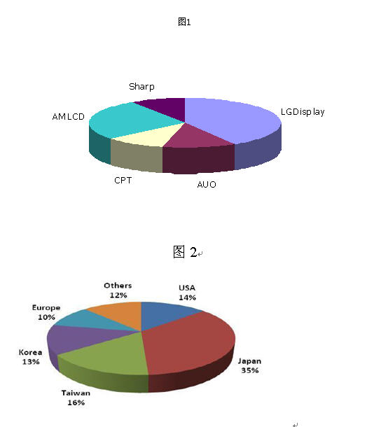 數據顯示,國內所有的LED TV面板來源全部進口,其中有部分open cell的模式,但是背光模組仍是采用指定購買的方式。從中國大陸地區(qū)LED面板供應來源來看,以2010年第一季度為例,主要供貨來源為LG Display, AMLCD, AUO, CPT(如圖1),其中CPT供貨多數為小尺寸。而從全球LED面板產值來看,日本廠商目前為市場領導者,臺灣和韓國廠商積極擴大產值(如圖2)。由此來看,LED TV面板產業(yè)市場集中度非常高,未來的LED TV市場的競爭格局主要受限于廠商的資源分配情況。