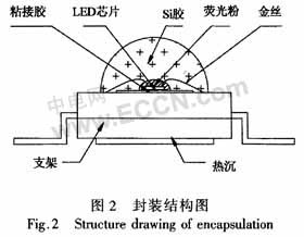 Si襯底的功率型GaN基LED封裝采用仿流明的支架封裝形式,其外形有朗柏型、矩形和雙翼型。其制作過程為:使用導熱系數較高的194合金金屬支架,先將LED芯片粘接在金屬支架的反光杯底部,再通過鍵合工藝將金屬引線連接LED芯片與金屬支架電極,完成電氣連接,最后用有機封裝材料(如Si膠)覆蓋芯片和電極引線,形成封裝保護和光學通道。這種封裝對于取光效率、散熱性能、加大工作電流密度的設計都是最佳的。其主要特點包括:熱阻低(小于10℃/W),可靠性高,封裝內部填充穩(wěn)定的柔性膠凝體,在-40~120℃范圍,不會因溫度驟變產生的內應力,使金絲與支架斷開,并防止有機封裝材料變黃,引線框架也不會因氧化而沾污;優(yōu)化的封裝結構設計使光學效率、外量子效率性能優(yōu)異,其結構見圖2。