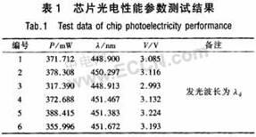 通過優(yōu)化Si襯底表面的處理和緩沖層結構,成功生長出可用于大功率芯片的外延材料。采用Pt電極作為反射鏡,成功實現(xiàn)大功率芯片的薄膜轉移。采用銀作為反射鏡,大大提高了反射效率,通過改進反射鏡的設計并引入粗化技術,提高了光輸出功率。改進了Ag反射鏡蒸鍍前p型GaN表面的清洗工藝和晶片焊接工藝,改善了銀反射鏡的歐姆接觸,量子阱前引入緩沖結構,提高了芯片發(fā)光效率,優(yōu)化量子阱/壘界面生長工藝,發(fā)光效率進一步提高,通過改進焊接技術,減少了襯底轉移過程中芯片裂紋問題,芯片制備的良率大幅度提高,且可靠性獲得改善。通過上述多項技術的應用和改進,成功制備出尺寸1mm×1mm,350mA下光輸出功率大于380mW的藍色發(fā)光芯片,發(fā)光波長451nm,工作電壓3.2V,完成課題規(guī)定的指標。表1為芯片光電性能參數測試結果。