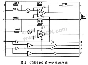 在CCD的應用領域中。相關雙采樣電路得到了廣泛的應用。很多公司專門研發(fā)了相關雙采樣的集成電路芯片。這些專用芯片不僅使用方便,且性能也能得到很大的提高。CDS1402芯片是一種典型的相關雙采樣電路芯片,它是專門為CCD成像器件研制的,用來消除復位噪聲。CDS1402進行了優(yōu)化,適合用于10~14位轉換精度的數字視頻。低噪聲的CDS1402芯片也是利用對高低電平信號的采樣并相減來精確確定視屏信號的。結果在CCD輸出的浮動電容器上,那些剩余電荷和kTC噪聲被最大限度的消除。CDS1402芯片一共有24個引腳。它包含有2個獨立的采樣保持放大器和S/H電路,每個S/H電路都有獨立的控制線,輸人和輸出管腳,有兩個管腳提供偏置調流和調壓。一般來說,CCD的輸出信號都要連接到2個S/H的輸入端,S/H1端用來采集和保持偏置信號,它的輸出值與CCD輸出信號相減,當CCD輸出偏置+視頻信號的時候,S/H2端就進入信號的采集狀態(tài),從而獲得有用的視頻信號。