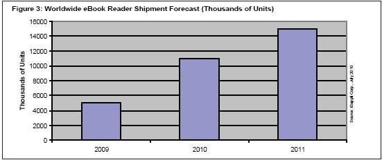 iSuppli公司預(yù)測,2010年全球是電子書閱讀器出貨量將增至1100萬個,比2009年的500萬個增長120%,如圖3所示。目前,iSuppli公司無意大幅改變這個短期預(yù)測。