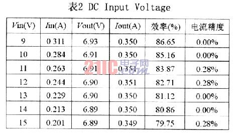 表2為輸入用直流電源,電壓范圍9~15V,從表中可以看出Iout幾乎不因輸入電壓不同而變動,效率為79.75~86.65%,電流精確度0.00~0.28%。(表2的數(shù)值是用1WLED量測)