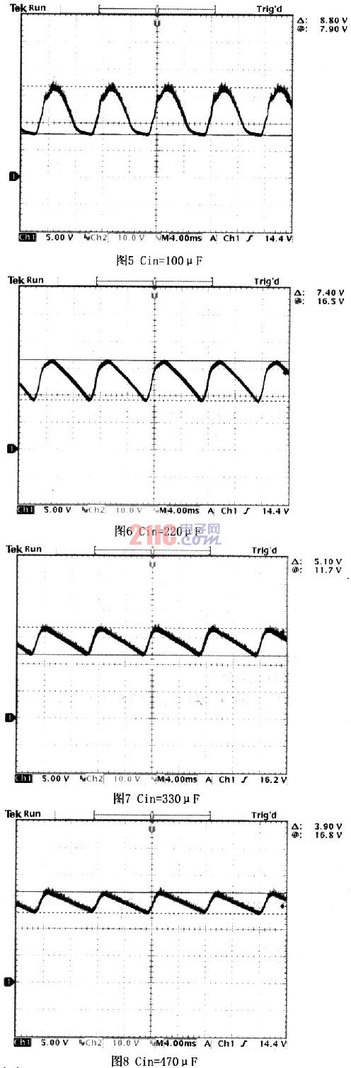 圖5~圖8列出了在不同輸入電容值情況下,輸入紋波Vin:CHl與SW:CH2的變化情形,輸入電容值越大輸入電壓紋波越小,圖5中因為紋波太大,造成Vin最小值剛好等于LED導通電壓,這時候PWM全開,如果電容更小時LED導通電壓不足,造成LED會無法發(fā)亮,圖8中電容用330μF就能讓輸入電壓不會過低。(串聯(lián)3顆1WLED)