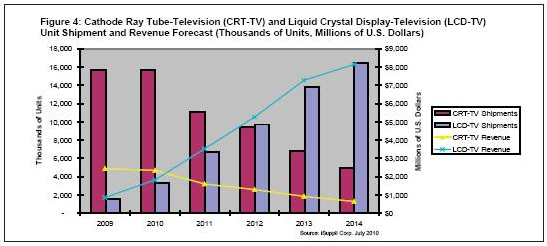 總體來看,CRT電視銷售額在2011年將降至16億美元,比2010年的23億美元減少32.3%。相比之下,液晶電視銷售額2011年將增長(zhǎng)到35億美元,比2010年的18億美元大增94.3%。