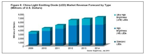 中國LED市場覆蓋眾多應(yīng)用領(lǐng)域,包括LED顯示器、街燈、普通照明、交通信號、手機鍵盤和數(shù)碼相機閃光燈,以及大尺寸液晶電視、筆記本和其它顯示器的背光。合計來看,中國液晶背光市場將強勁增長,2014年銷售額將從2010年的4.68億美元上升到12億美元,復(fù)合年度增長率為25.7%。