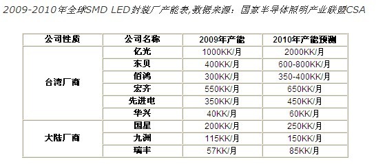 臺(tái)灣封裝第一大廠億光2010年LED TV背光源出貨大幅放量,已接到LG、三星、瑞軒等大廠訂單,初步規(guī)劃,SMD月產(chǎn)能將從10億顆倍增至20億顆。另一大廠東貝目前SMD月產(chǎn)能為4億顆,2010年也是鎖定擴(kuò)充大尺寸背光用SMD封裝產(chǎn)能,SMD月產(chǎn)能將達(dá)到6億顆至8億顆,而宏齊以及佰鴻也都有擴(kuò)產(chǎn)計(jì)劃。2010年臺(tái)廠SMD產(chǎn)能成長(zhǎng)至少5成至1倍。