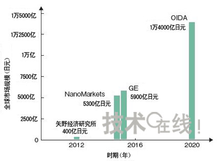 圖有機EL照明/光源市場到2020年將占到照明市場整體的2成圖為針對包括普通照明、特殊照明及背照燈等在內(nèi)的有機EL照明今后的市場規(guī)模,日本矢野經(jīng)濟研究所、NanoMarkets、GE及OIDA發(fā)布的預(yù)測及目標(biāo)。市場規(guī)模方面,預(yù)計2015年全球?qū)⑦_(dá)到5000多億日元,到2020年將大大超過1萬億日元。