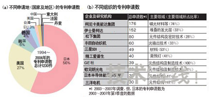 圖日本廠商在開發(fā)方面領(lǐng)先圖為Cintelliq公司就以實現(xiàn)有機EL照明為目的的專利申請數(shù)所做調(diào)查的結(jié)果。按申請地劃分,日本為56%,大大超出排在第2位的美國,遙遙領(lǐng)先(a)。在本圖中,1994~2006年的專利申請數(shù)通過2003年以后的文獻(xiàn)調(diào)查得到。按不同組織劃分,柯尼卡美能達(dá)集團為176件,排在第1位(b)。大約3/4的專利與藍(lán)色磷光材料有關(guān)。(b)為2003~2007年有機EL照明(包括背照燈)專利按組織劃分的申請數(shù)(前10家公司)及主要領(lǐng)域。由于按組織劃分的日本專利申請數(shù)數(shù)據(jù)中不包含2007年第2季度以后的數(shù)據(jù),因此,實際上日本企業(yè)的申請數(shù)有可能更多。