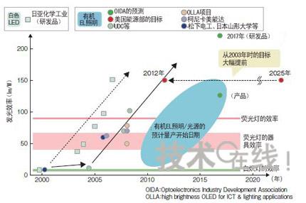 圖效率方面與白色LED僅有“約2年的差距”圖為有機EL照明發(fā)光效率的變化走勢與白色LED研發(fā)品的對比。2000年前后,實際上白色LED與有機EL照明的發(fā)光效率幾乎沒有差距。其后的4~5年,在有機EL照明開發(fā)沒有大的進展的情況下,被白色LED遠(yuǎn)遠(yuǎn)落在后面。目前,有機EL照明的研發(fā)如火如荼,2008年6月實現(xiàn)了高達(dá)102lm/W的發(fā)光效率。其與白色LED的差距,在發(fā)光效率方面縮小到了大約2年。