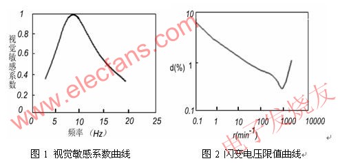 可以被人眼感知的光源閃爍,可以通過統(tǒng)計(jì)的方法來測得人眼的對光源閃爍的感覺特性。圖1是人眼對不同頻率的電壓波動(dòng)引起的視覺敏感系數(shù)曲線。從曲線上可以看出最敏感的頻率是8.8Hz,偏離該頻率后,敏感度隨頻率而降低。當(dāng)閃爍頻率40Hz以上時(shí),感覺就不靈敏;50Hz以上的閃爍就完全沒有感覺。