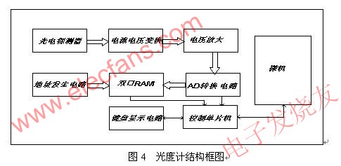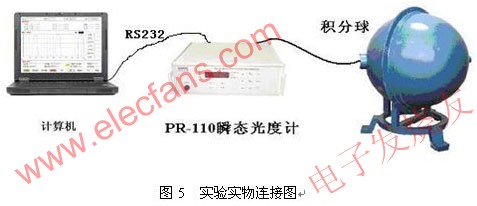 為了精確測量光通量,把光源放在積分球中。經(jīng)過V(λ)校準(zhǔn)的光電探測器接受光信號(hào),其輸出的電信號(hào)經(jīng)過放大轉(zhuǎn)換電路,將光電探測器輸出的光電流信號(hào)轉(zhuǎn)換成較大的電壓信號(hào),利用AD轉(zhuǎn)換器進(jìn)行采樣。由于單片機(jī)讀取和存儲(chǔ)數(shù)據(jù)速度較慢,故而采用了雙口RAM和地址發(fā)生電路,使得光度計(jì)能夠在采用時(shí)自動(dòng)對數(shù)據(jù)進(jìn)行存儲(chǔ)。單片機(jī)則在所有采樣過程執(zhí)行完畢后,再從雙口RAM內(nèi)讀取數(shù)據(jù),并發(fā)送給微機(jī)顯示處理。系統(tǒng)結(jié)構(gòu)圖和實(shí)物連接圖如下。