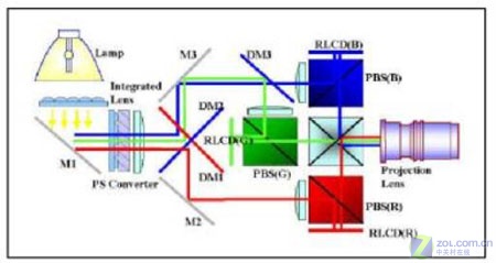 LCOS光學(xué)引擎目前以三片式為主,三片式是將光源經(jīng)分光棱鏡將光束分為紅、藍(lán)、綠光后,再分別將光束投射入三片LCOS面板,將投射出的三色影像經(jīng)過合光系統(tǒng)加以結(jié)合形成彩色影像。就Nikon設(shè)計(jì)的IBM4-Cube光學(xué)引擎架構(gòu)來看,由于三片式LCOS光學(xué)引擎除了需要三片面板外,并結(jié)合多項(xiàng)的分光、合光光學(xué)系統(tǒng),因此體積較大、成本也較高,不過由于可以達(dá)到較高的光學(xué)效率,又具備高畫質(zhì)的特性,因此主要是朝高階的專業(yè)用途發(fā)展,主要的產(chǎn)品以JVC的多款投影機(jī)為主,除此之外,三片式光學(xué)引擎還有ColorLink采用的ColoRQuard架構(gòu)、Philips的Prism架構(gòu),致伸發(fā)展的Dichroic-PBS架構(gòu),及Unaxis的ColorCorner架構(gòu)等。