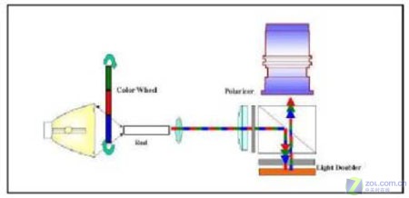 單片式ColorWheel光學(xué)引擎則是以快速旋轉(zhuǎn)的ColorSwitch將白光形成循序的紅、藍(lán)、綠光,并將三原色光與驅(qū)動(dòng)程式產(chǎn)生的紅、藍(lán)、綠畫面,同步形成分色影像,再藉由人眼視覺暫留的特性,最后在人腦產(chǎn)生彩色的投影畫面。類似的技術(shù)有:Displaytech發(fā)表的FieldSequentialColor、Philip所采用的ScrollingColor-RotatingPrism架構(gòu)、及JVC采用的SpatialColor–Hologram架構(gòu)。[page]