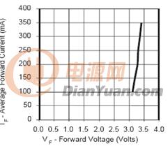 假如用干電池或蓄電池供電,那么因?yàn)長ED伏安特性的非線性,很小的電壓變化就會(huì)引起很大的電流變化,上圖中電源電壓在3.3V時(shí)正向電流為20mA的LED,如果用3節(jié)干電池供電,新的電池電壓超過1.5V,3節(jié)就是4.5V,LED的電流就會(huì)超過100mA,很快就會(huì)燒壞。對于1W的大功率LED也是如此,圖2是某公司1W的LED伏安特性,而一個(gè)12V蓄電池的電壓,在充滿電到快放完電的電壓可以從14.5V降到10.5V。相差將近20%。從伏安特性上可以看出,電源電壓的10%的變化(3.4V-3.1V),就會(huì)引起正向電流的3.5倍的變化(從350mA變到100mA)。