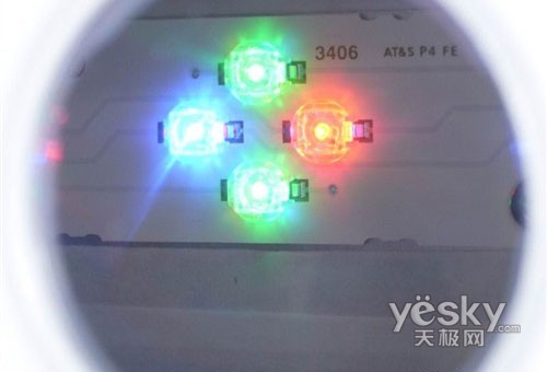 索尼70X300A上使用的RGB-LED背光單元放大圖,每一組由2個綠光、1個紅光和1個藍(lán)光LED元件組成
