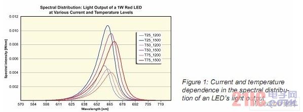 LED的光輸出特性主要取決于其工作條件。前向電流增加會使LED產(chǎn)生更多的光。但當(dāng)前向電流保持不變,光輸出會隨著LED的溫度升高而下降。圖1描述了溫度,電流和光輸出的關(guān)系。并且描述了一個LED相關(guān)的顏色光譜在峰值波長處的偏移。用于普通照明的單色LED,藍(lán)色光譜的峰值會發(fā)生偏移,因此改變了LED所謂的色溫。這會對LED照明空間內(nèi)的感官產(chǎn)生影響。