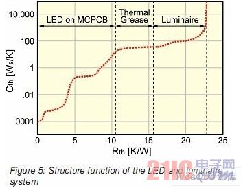 在圖5中,最初的曲線非常陡峭,同時熱容被加熱。這個曲線進(jìn)行了注解,描述了LED/MCPCB,封固劑(導(dǎo)熱硅脂)和照明設(shè)備三個階段。但在第一個階段內(nèi),曲線描述了更小的一些階段,譬如Dieattach,散熱板,甚至是緊固銅散熱板和MCPCB的膠水。注意這個圖形證實了早期的一個論點,那就是LED自身的熱阻占整個系統(tǒng)結(jié)點至環(huán)境熱阻的50%。